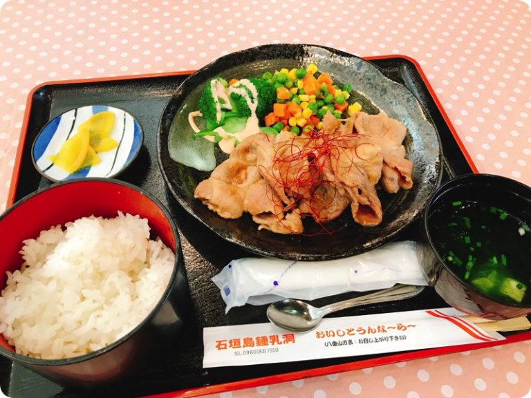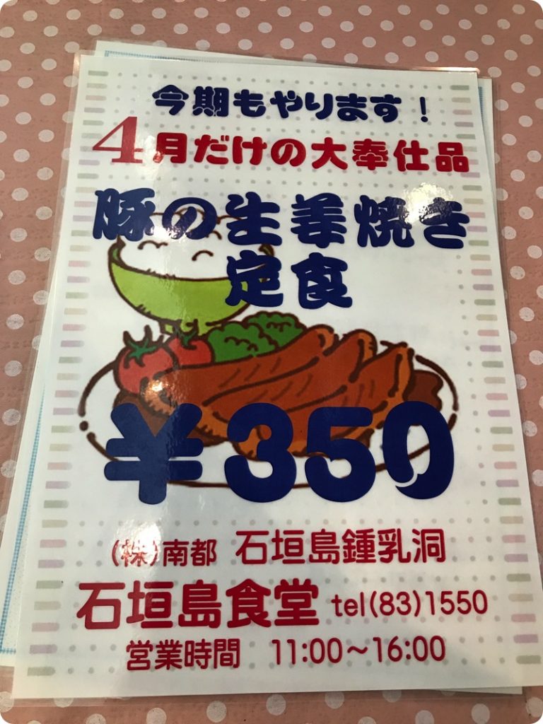 石垣島鍾乳洞内にある石垣島食堂。4月だけの大奉仕メニューということで、今月は豚の生姜焼きがなんと350円とのこと!!
