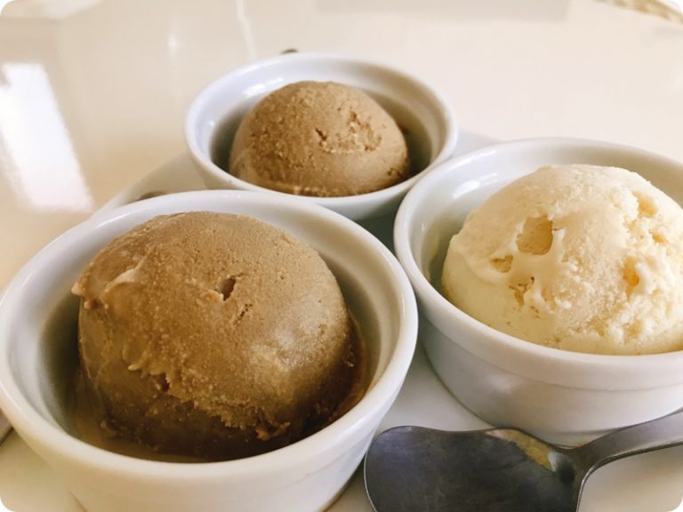 デザートバジェラート。ランチと一緒だと200円。黒糖キャラメルとサポテ(白)