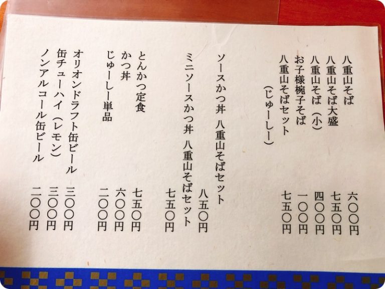 メニューはシンプル。ただ八重山そば(600円)を注文するより150円プラスでミニソースかつ丼がつくというのでそちらにしました。