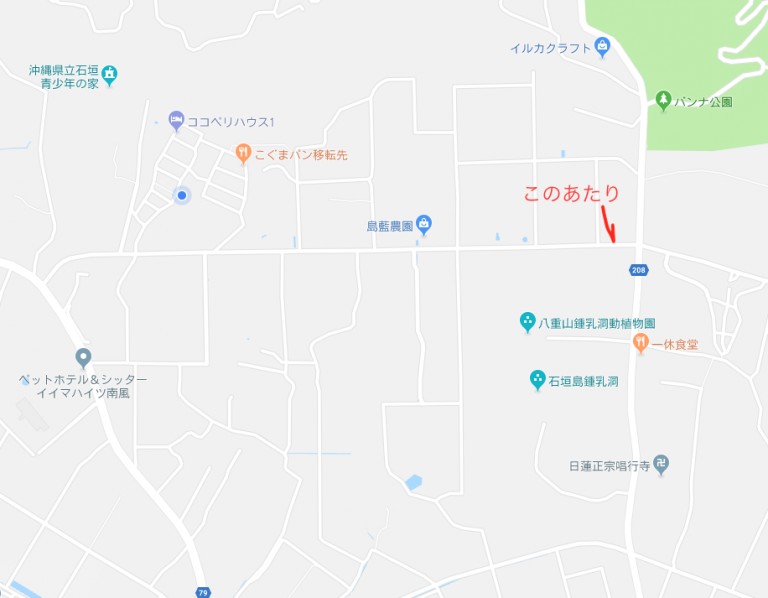 場所はバンナ公園南口に向かい、坂を登っていくと、交差点があり、左折すると石垣青少年の家に向かう道です。