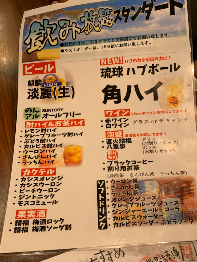 飲み放題プランを選択。1780円。たぶん十杯くらい飲んだから元取りました。