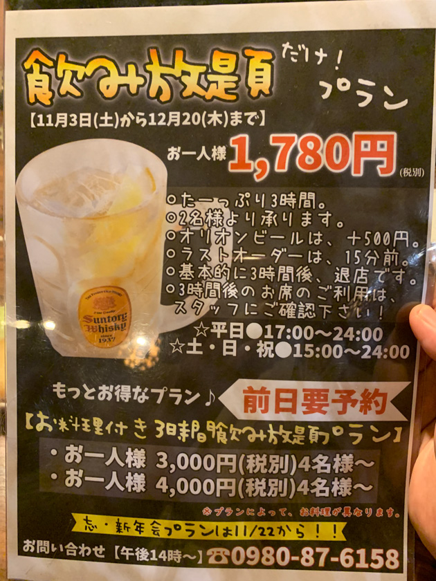 土日祝日が15時から開店、20時まで淡麗が100円で飲めるので思いっきり酔っぱらえそうです。