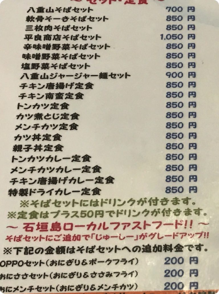 そばセットには最初からドリンクがついて、定食は+50円でドリンクがつくそうです。アイスコーヒー、アイスティー、さんぴん茶から選べます。